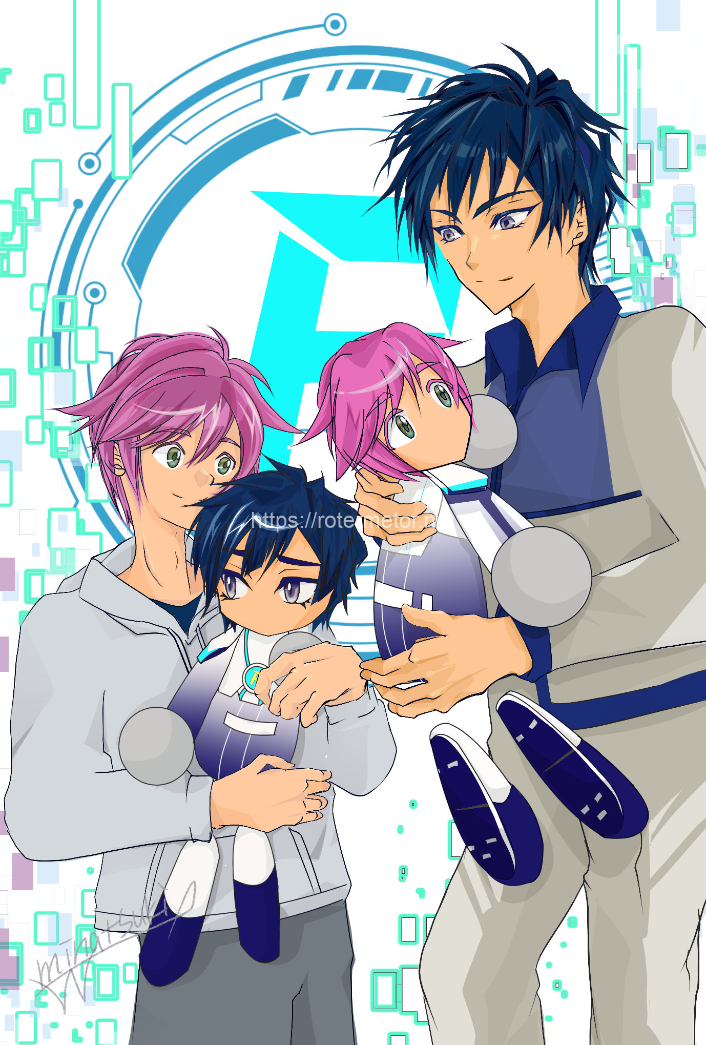そしてめちゃくちゃ細かいことを言うと、パワ体の方が全体的にお色が鮮やかというか彩度高めなのはわざとです。フューチャーズのシナリオだと、VR世界なので…現実の方の姿だと、ピグタの髪もハルキの髪もほんのちょっとだけ彩度落ちてる。メタヤンス世界=光の三原色なので彩度バッキバキ、現実空間=色の三原色なのでそこまでド原色ではないだろう、っていう。まあ、空中にホログラム広告浮いてる世界だから色彩派手でもおかしくは無いけども。