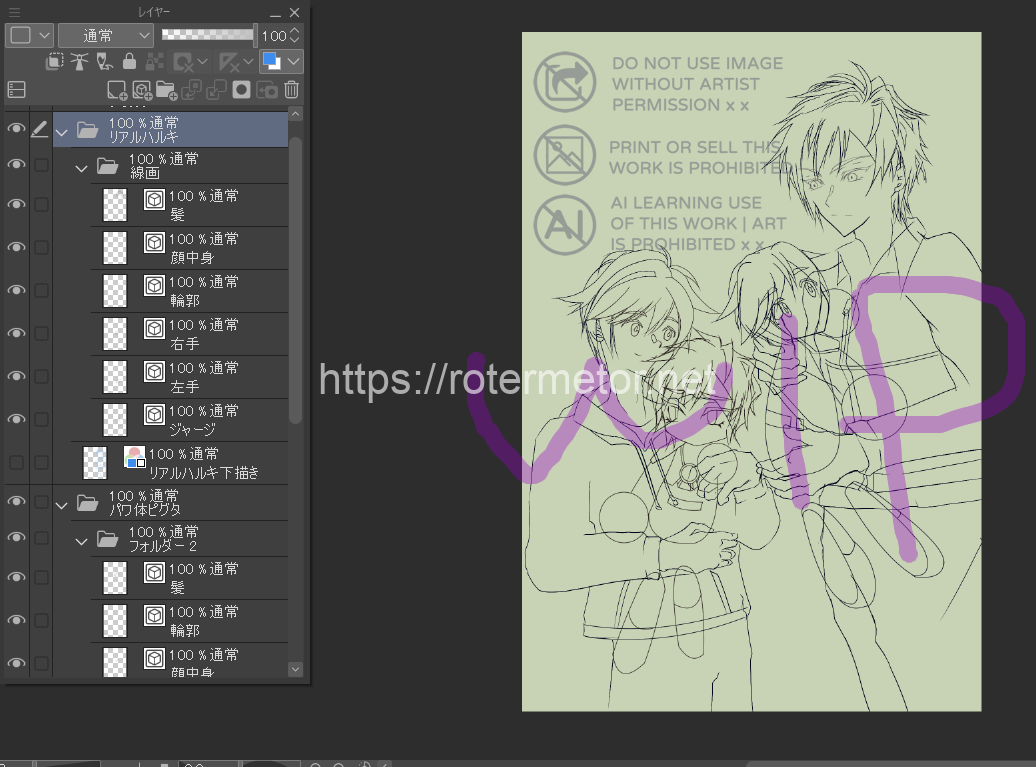 髪の線画は、ハルキの髪色が濃いので、塗った後だと殆ど隠れてるというか。潰れてる? 状態になってますが。