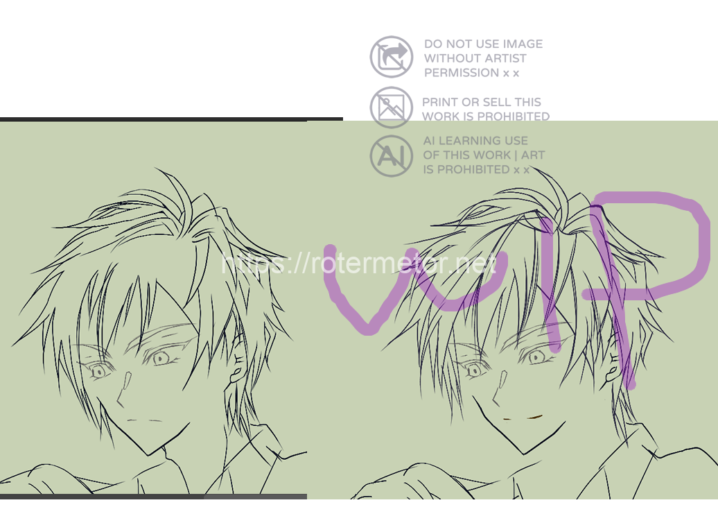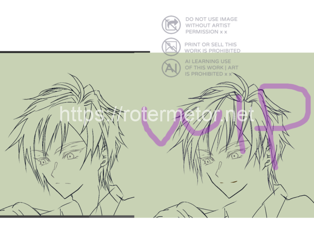 何か違う、と髪を修正することにして先に髪を直していったのですが、表情も修正してました。下描きからラフ時点までは、ハルキの表情を割と仏頂面というか口角下がった不機嫌そうに見えなくもない表情でしたが。
