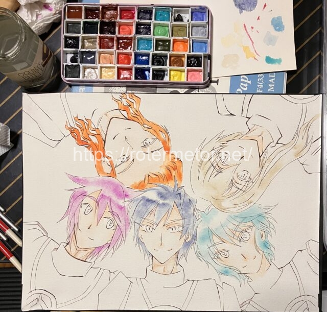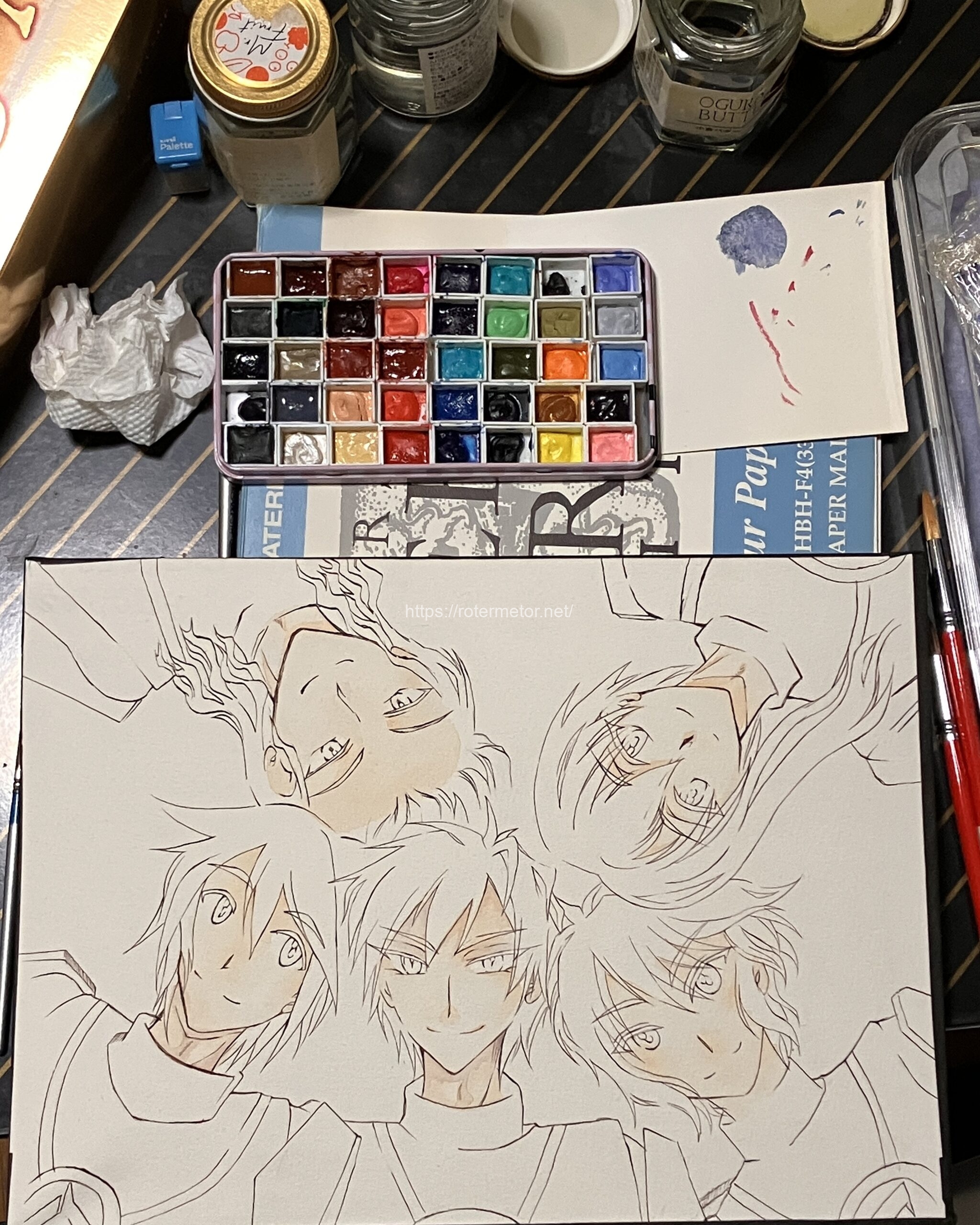 トオルに限らず、金髪のキャラクターは最初から黄色を塗ってしまうとスー〇ーサ〇ヤ人になってしまうので、明らかに「黄色」と定義されているキャラクター以外は基本、私は黄色は最初には塗らないようにしています。トオルの髪のベースに塗っているのはダニエルスミスのバフチタニウム。いつもは金髪キャラのベースはセヌリエのウォームグレーを使っているのですが、DS入手したので使ってみたくて。ハルキの髪はツンドラブルー、アオの髪がコバルトターコイズライト、トオルがバフチタニウム、キリヤがトランスルーセントオレンジ、ピグタがコバルトバイオレットライト。シュミンケホラダムのトランスルーセントオレンジ、ごく薄く溶くと肌にも使えるいい感じの淡いお色になるのですが、濃く溶くと「炎!」って感じの揺らめきのある、澄んだ赤系統のオレンジになるんですよね。これが無いと水彩絵でキャラクター描けない。