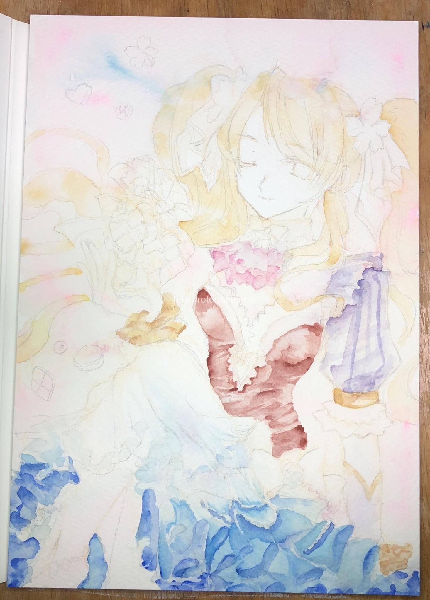 前回の続き。乾く前はスカートのグラデーションが上手く出てるか不安だったけど、全体に淡く透明感とふんわり感は何とかキープできているような気がする。