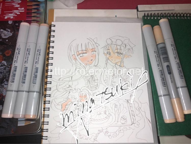 コピック絵その後 crs 2018.04.232018.07.29 線画状態と塗り始め。 続きは帰宅してから。紙はコピックスケブ(特選上質紙) 水娘はR00/R000/YR00 森娘はE00/E50/E51 ソコラタも水娘と同じ肌色に。中央のパイ(タルト?)は最初はアップルパイにしようと思ってたんだけど、ピーチタルトにする予定。 …藍色っぽい色は手持ちにないから、スヴィンのときみたいにグレー系と青を重ねて何とか出すかなー。 それかベースコピックで色鉛筆。 favoriteすき!送信中です×